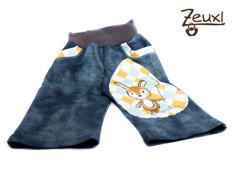 Daher noch eine Hose zum Shirt. Dafür speckte ich die Pobeisser Hose von Knuddelmonster gewaltig ab. Nur den Hasen vorne und hinten einpaar Rauten drauf appliziert und fake Taschen dran. Sonst nix. Oben ein Bündchen. Fertig!