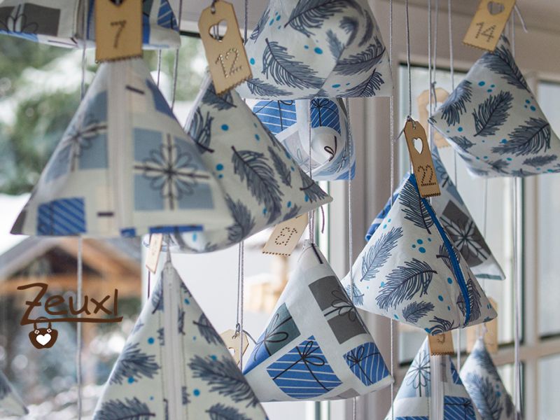 Für das Innenfutter nutzte ich Baumwolle aus meinem Fundus und den Außenstoff verstärkte ich mit Decovil light. Das hat mir, was die Stabilität betrifft, tatsächlich am besten gefallen. Außerdem war mein Plan, mein Reißverschluss-Chaos etwas auszudünnen und ganz verschiedene Reißverschlüsse für diese Taschen zu verwenden. Allerdings besitze ich richtig viele metallisierte Reißverschlüsse, aber keine passenden Zipper dazu. Also entschied ich mich aus Zeitgründen im Laden vor Ort Endlosreißverschluss zu besorgen. Sie hatten dort nur die Farbe Weiß, ohne Metalloptik. Wer knapp dran ist, muss eben mit dem zufrieden sein was verfügbar ist. Jetzt, wo der Pyramidentaschen Adventskalender hängt, stören mich die Reißverschlüsse überhaupt nicht mehr.