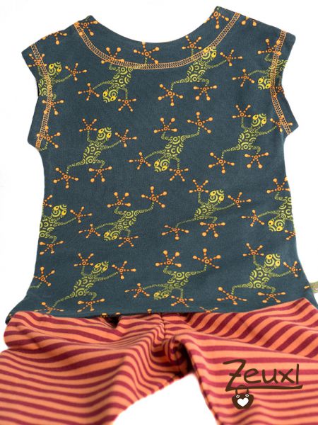 Den tollen Bio-Jersey Tiny Frog habe ich schon vor einer Weile bei Lillestoff erstanden. Dort finde ich ihn im Moment nicht, aber es gibt ihn beispielsweise auch hier. Für die Hose verwendete ich einen leichten Streifenjersey aus meinem Fundus.