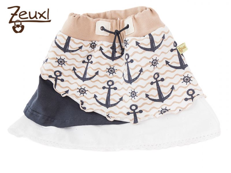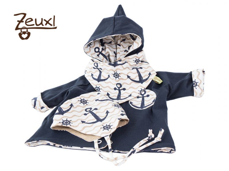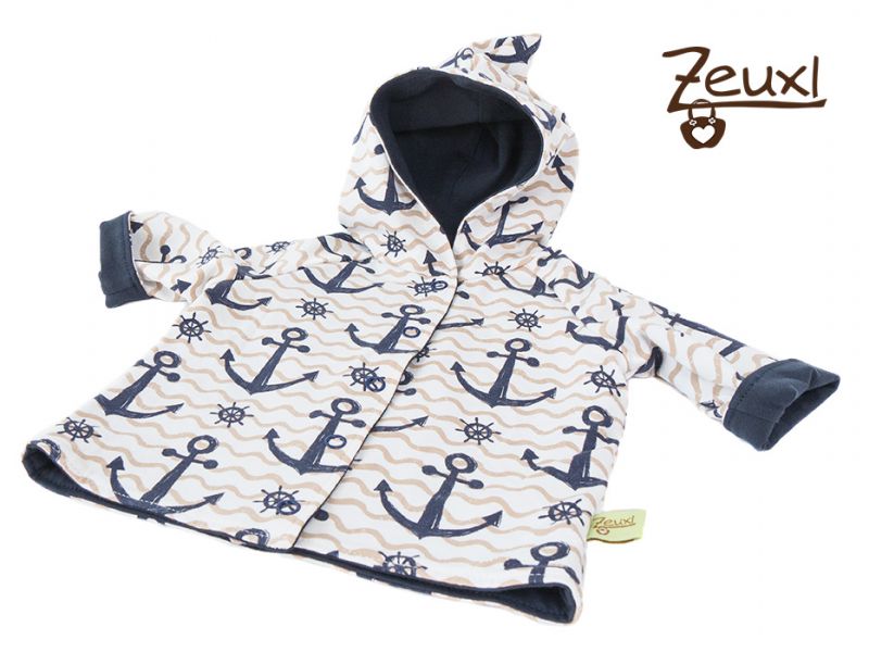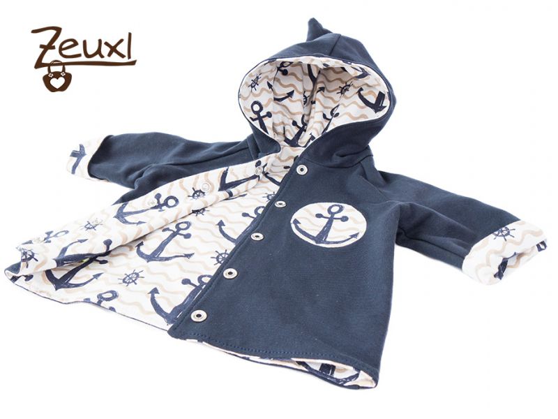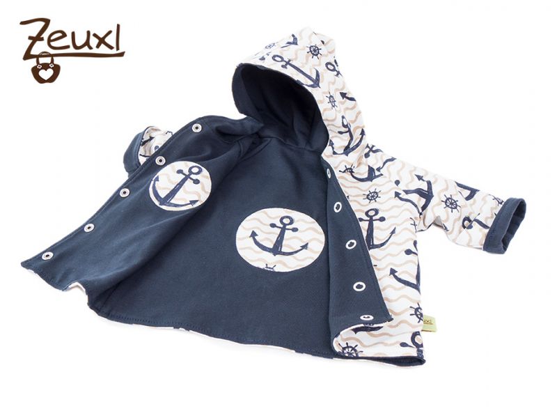Bei der Stoffauswahl entschied ich mich für den maritimen Ankerjersey und wählte für Innen einen dunkelblauen Jersey. Damit die Jacke auch gewendet nicht zu trist und langweilig ist, applizierte ich auf den Rücken und auf einer Vorderseite je einen Anker.