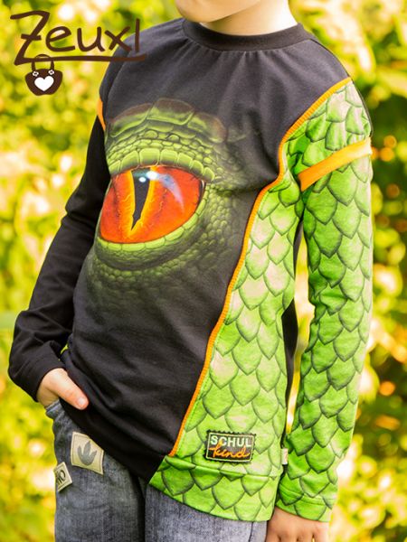 Die Farben dieses Panels sind doch wirklich der Hammer, oder? Für das Rückenteil und den einen Ärmel verwendete ich einfach schwarzen Jersey. Dazu noch orange Akzente an der Teilung und den Ärmeln und das Einschulungsshirt war so gut wie fertig.