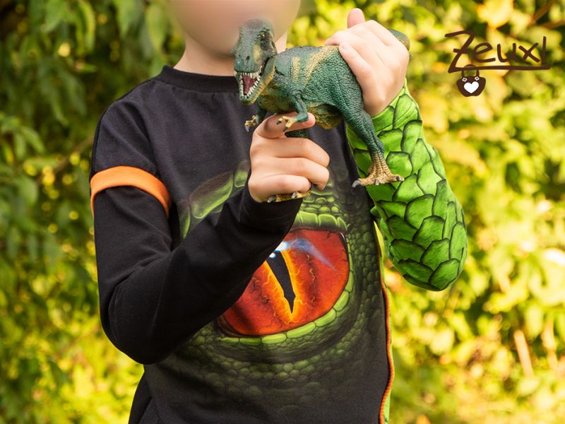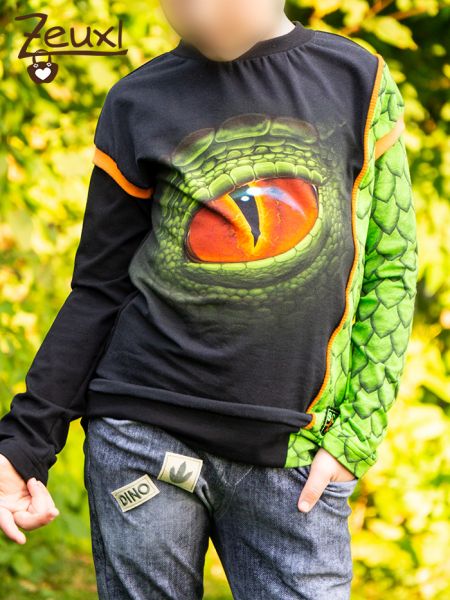 Zum Dinoauge Shirt trägt er die Wilde Möhre von neulich (hier). Ebenfalls mit passenden Labels.