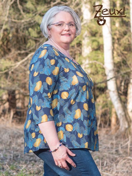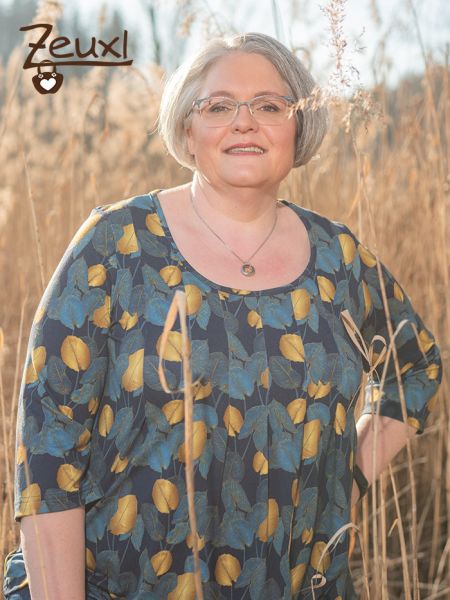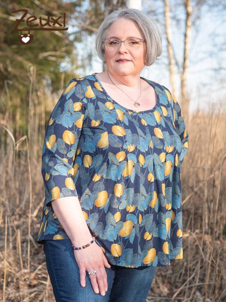 Zum Glück habe ich es endlich ausprobiert, denn Violetta ist genau mein Ding. Ich bin mehr als zufrieden damit. Nur musste ich das Shirt etwas kürzer als eigentlich geplant machen, sonst hätte mir der tolle Stoff mit den Blättern nicht gereicht. Den kaufte ich kürzlich bei Stofflounge und der hat so schöne Farben und einen ganz tollen Fall.