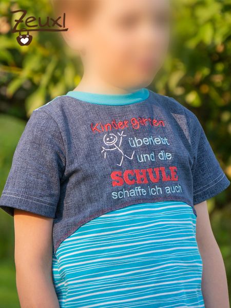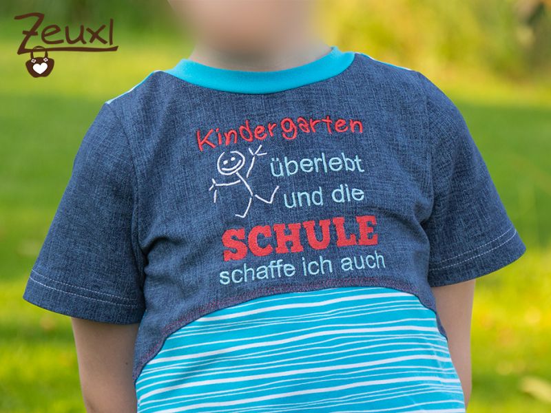 Der Spruch ist eine Stickdatei, die es bei TamElia Stickdesign als Freebie gibt. Die hatte ich schon eine Weile auf meinem PC und nun war der richtige Zeitpunkt gekommen. Also hat der Bub ein Kindergarten-Abschieds-Shirt bekommen.