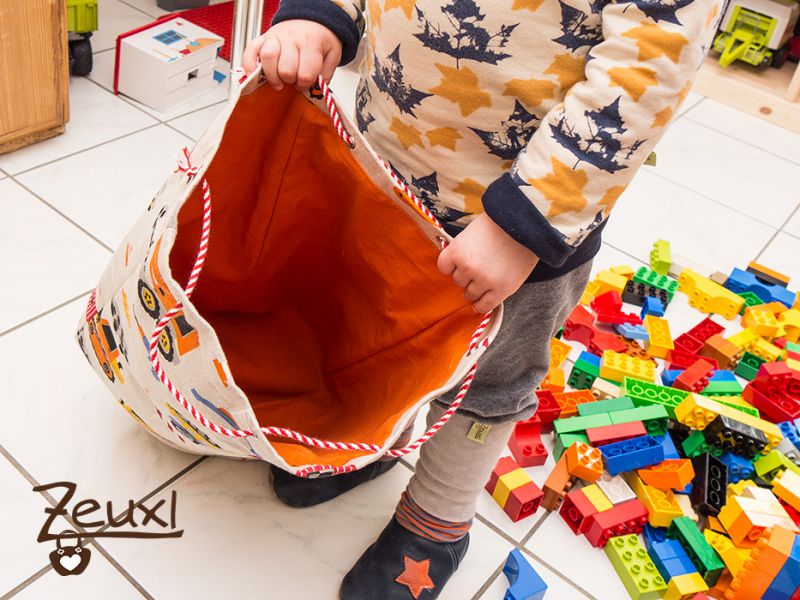 Und unser Bub? Der findet den Stoff klasse und musste natürlich erstmal ausprobieren was noch so alles in diesem riesen Utensilo verschwinden kann. Schwer begeistert ist er auch von der Tatsache, dass es einen Heidenlärm macht, den ganzen Sack auf dem Fliesenboden aus zu kippen…