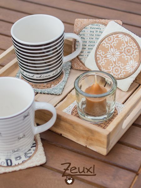Damit die Mug Rugs bei der Übergabe des Geschenks mehr hermachen besorgte ich ein kleines Holztablett, zwei passende Tassen und ein Kerzenglas mit Kerze.
