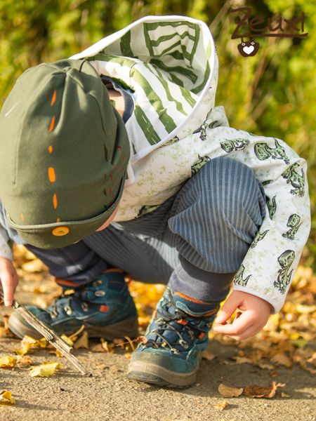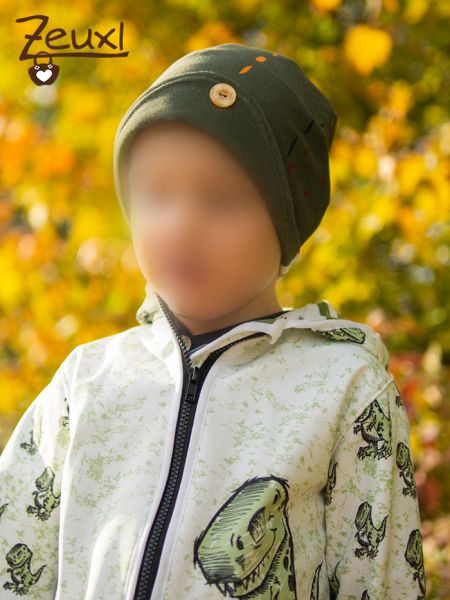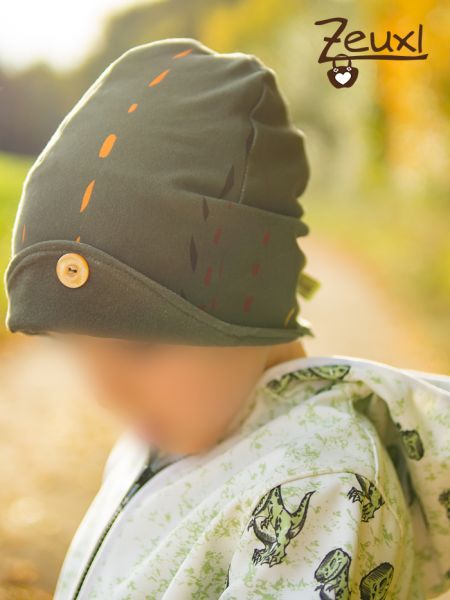 Dazu gab es für den Buben noch eine Mütze. Diesmal die Cuff Beanie von Lenipepunkt. Der Schnitt ist ein Freebie und mit dem Umschlag, den ich mit einem Knopf versehen hab, nicht so fad wie andere Beanies. Dafür verwendete ich noch einen Rest des Sommersweats vom Shirt neulich (hier).