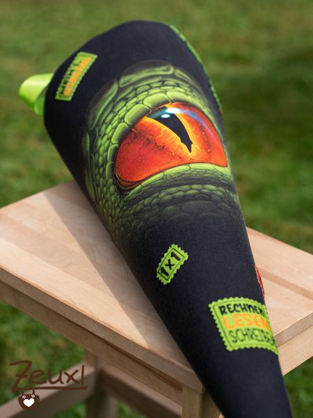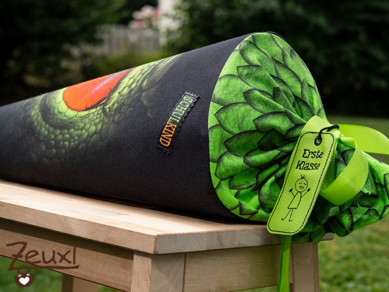Ganz ehrlich hatte mir das Thema Schultüte nähen einiges an Kopfzerbrechen bereitet. Viele schöne Inspirationen hatte ich im Internet entdeckt und auch auf Stoffsuche bin ich schon bei Zeiten gegangen. Ich schwankte noch zwischen Weltraum, Dinos und ganz ohne Motiv aber dafür mit seinem Namen drauf. Dann bin ich über die Schultütenpanele von Stoffe Hemmers gestolpert. Peng, das isses! Das Auge, für den Bub und mich ist es eindeutig ein Dinoauge, ist der Hammer und dann auch noch diese Farben…