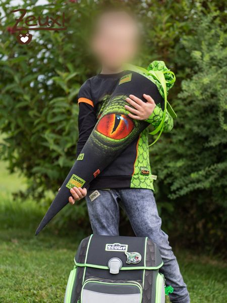 Der Schulranzen, den er sich ausgesucht hatte, passt perfekt zum Stoff. Natürlich wollte der Bub auch den passenden Stoff für ein Shirt mit Dinoauge. Leider gab es zu diesem Zeitpunkt nur den Schultütenstoff und daher wartete ich noch mit der Bestellung - fast zu lange, wie sich bald herausstellte. Denn plötzlich gab es das Schultütenpanel nicht mehr! Völlig panisch schrieb ich eine Mail und schilderte meine Lage. Schultüte mit Dinoauge bedeutet Beste Mama, kein Schultütenpanel würde dagegen ein großes Drama mit zu Tode betrübtem Kind an dessen ersten Schultag bedeuten.