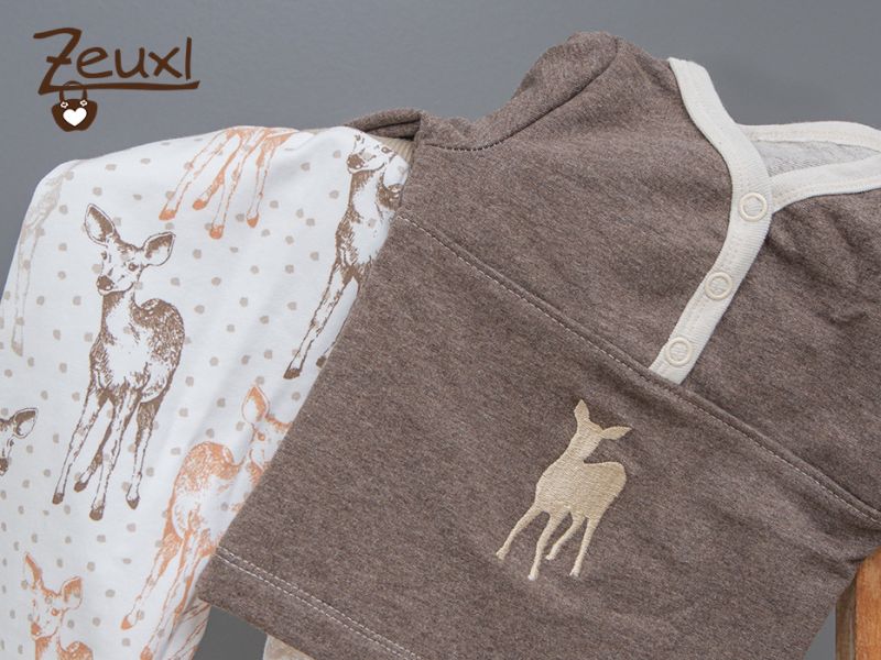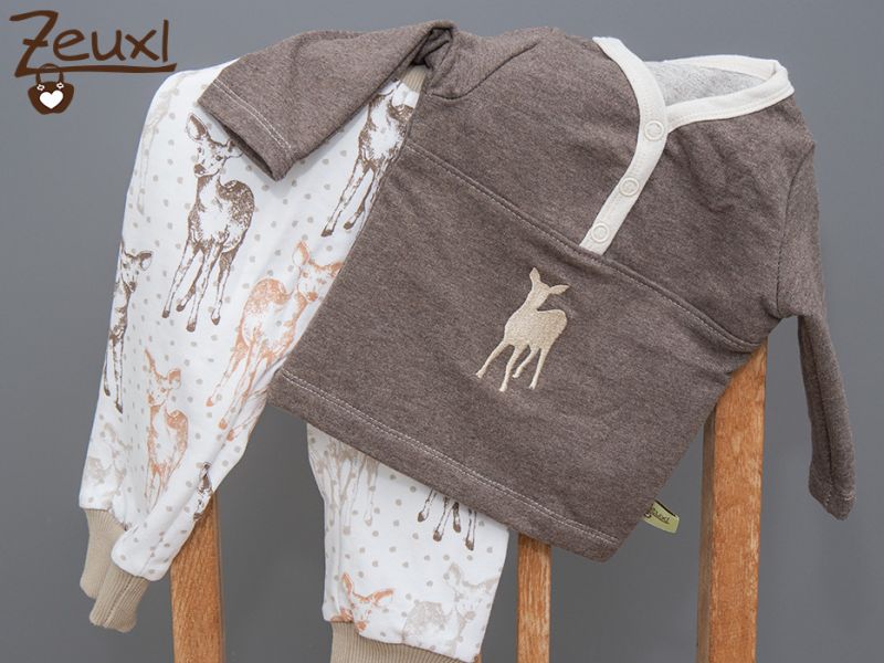 Passend dazu hatte ich einen braunen Sweat in meinem Stoffschrank, aus dem ich einen Knopfpulli von Klimperklein aus dem Babyleicht-Buch als Oberteil nähte. Mit der Knopfleiste meine ich, bekommt man ihn bei Babys relativ stressfrei angezogen. Damit beides wirklich schön zusammen passt, bestickte ich den Pulli noch mit einem kleinen Rehlein. Die Stickdatei ist von RockQueen und ist eine der ersten Dateien, die ich mir damals gekauft hatte. Ich sollte sie viel öfter verwenden, die Rehe und auch die Hirsche sind genau mein Ding.