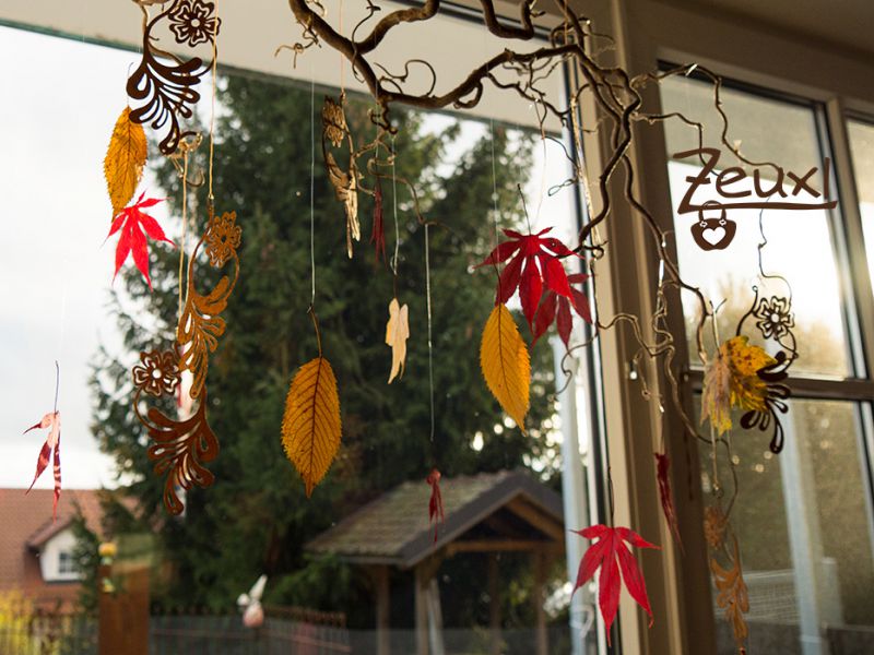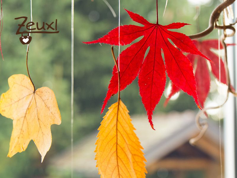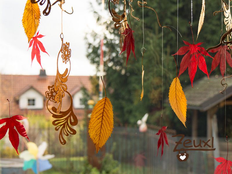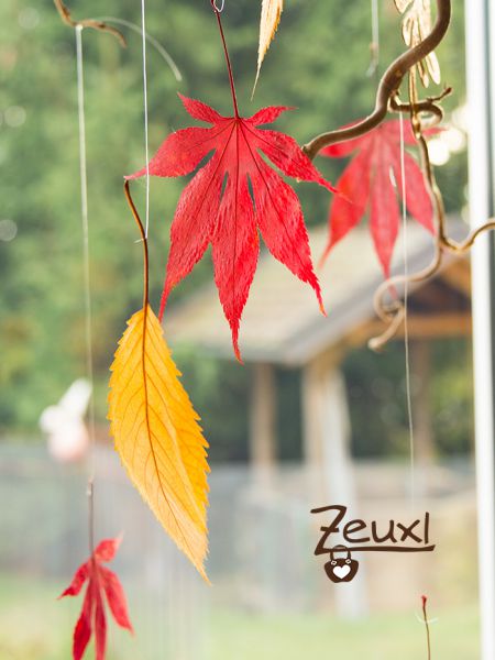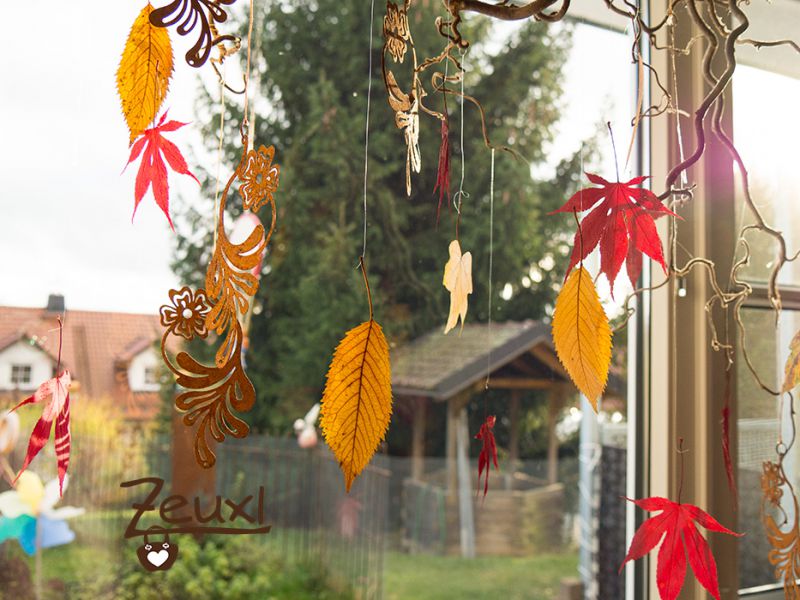 Dieses Jahr übernehmen diese gepressten Blätter die Aufgabe den Zweig aufzuhübschen. Der kleinste Luftzug lässt sie sanft hin und her schaukeln. An einer ganz feinen Nylonschnur hängen sie fast unsichtbar am Zweig.