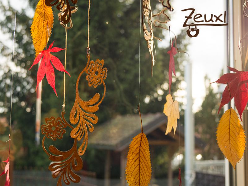 Seit vielen Jahren hängt an der Terrassentüre schon dieser Zweig. Die rostigen Anhänger bleiben das ganze Jahr über dort und werden mit zur Jahreszeit passenden Zierrat ergänzt.