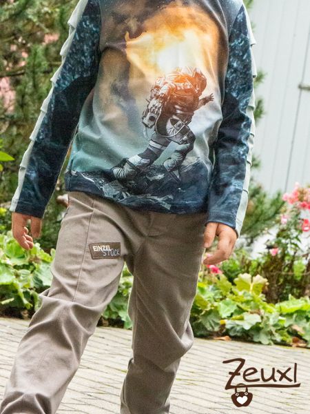So lag der Stoff erstmal im Schrank und wurde von mir nicht weiter beachtet. Über ein halbes Jahr später rief die liebe Nadine von Fadenspiel - Stick- und Plotterdateien mit Herz zum Probesticken für ihren Adventskalender auf. Zu den Dateien, die probegestickt werden sollten, zählte auch diese Space Explorer Datei. Und zack, kam der Stoff von der Messe genau jetzt zu seinem Einsatz. Jedoch bestickte ich nicht das Shirt mit dem Schriftzug, sondern eine passende Hose.