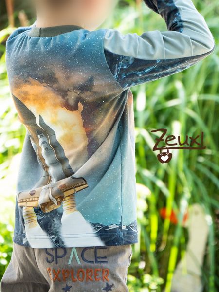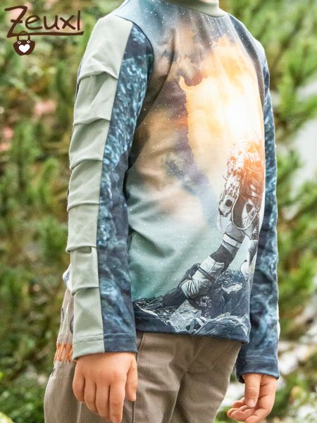 Ich vernähte den Astronautenstoff zu einem Louris Shirt. Die mittleren Ärmelstücke sind der Hingucker dieses Schnittes und hier aus unifarbenen Jersey. Den Louris Schnitt von Olilu nähe ich mittlerweile total gerne.