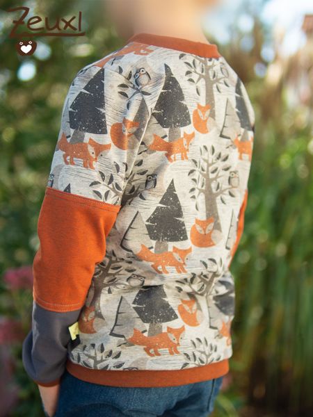Für die Unterteilungen an den Ärmeln verwendete ich einen rostfarbenen Jersey und als Untergrund für die Stickerei einen grauen Uni-Jersey. Hinten wollte ich den Fuchsstoff ohne Unterteilung und ich muss sagen, vernäht finde ich ihn nun überhaupt nicht mehr duster. Ich kann mir nun sogar ein komplettes Shirt aus diesem Stoff gut vorstellen. Gut, dass noch Stoff über ist…
