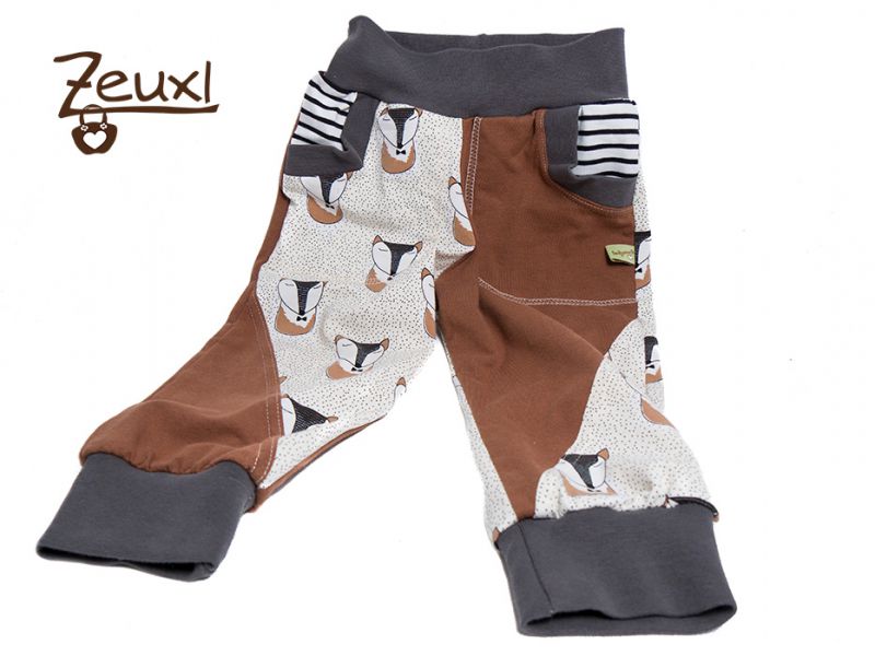 Erst als das Shirt fertig war ist mir aufgefallen, dass der Bub eigentlich keine Hose besitzt, die farblich gut passt. Leider war kaum mehr Fuchsstoff übrig. Deswegen musste ich die Pobeisser Pumphose (ebenso von Knuddelmonster) auch aus verschiedenen Stoffen zusammensetzen. Das Ergebnis finde ich nun gar nicht so schlecht.
