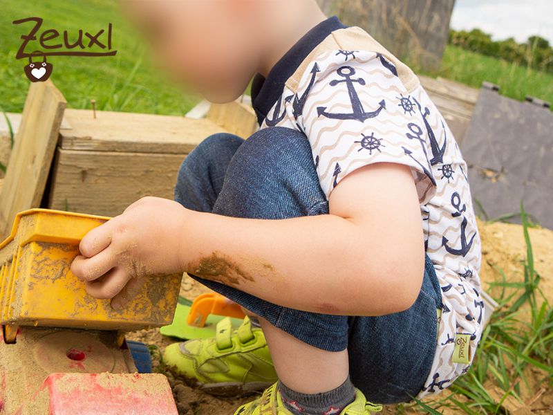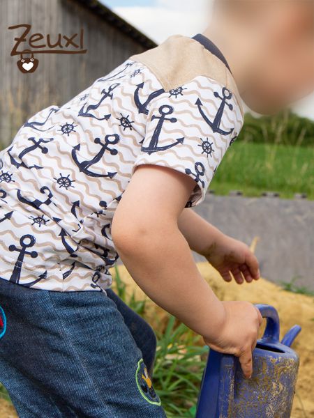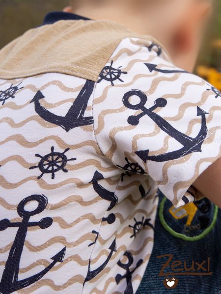 Für dieses Beispiel entschied ich mich einen Kalleson mit Passe, aber ohne Brusttasche und mit kurzen Ärmeln zu nähen. Der Stoff ist jetzt nicht extra dafür gekauft, sondern aus den Resten meines Anker-Shirts vom letzten Jahr. Und ja, es sind noch immer kleine Stücke davon vorhanden. Dafür findet sich sicher auch noch Verwendung;-) Das Design gefällt mir noch immer - Ankerliebe halt- richtig gut und deswegen habe ich kein Problem damit, dem Buben noch ein Oberteil daraus zu nähen.