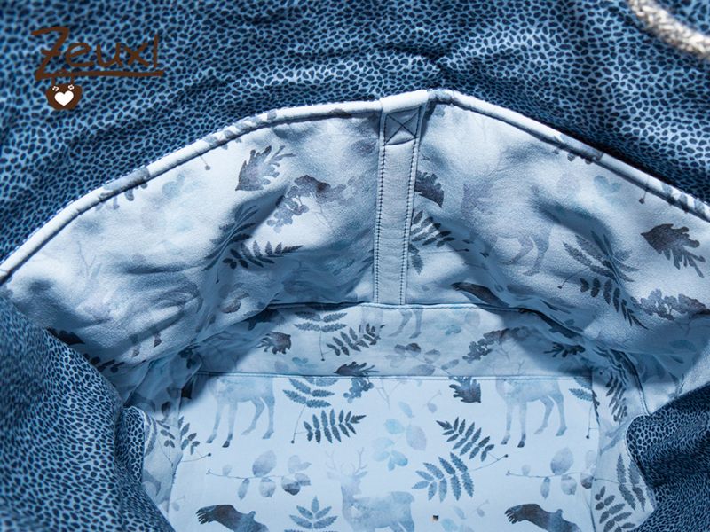 Oben und für das Innenfutter verwendete ich Baumwolle in dezenter Leooptik. Innen wählte ich für den Bodenbereich und die Steckfächer abermals den Softshell. Den verstärkte ich an der Außentasche übrigens um einen noch besseren Stand zu erhalten.
