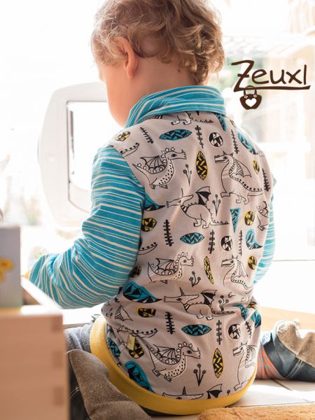 Aus dem tollen Drakar Drachenstoff und dem passenden Kombistoff von Tidöblomma, die übrigens beide GOTS zertifiziert sind, wurde wieder ein Hoodie Flo von Rockerbuben. Mir gefällt bei diesem Schnitt besonders die Kragen-Variante. Damit schließt das Shirt schön eng am Hals und es entsteht ein kleiner Rollkragenlook.