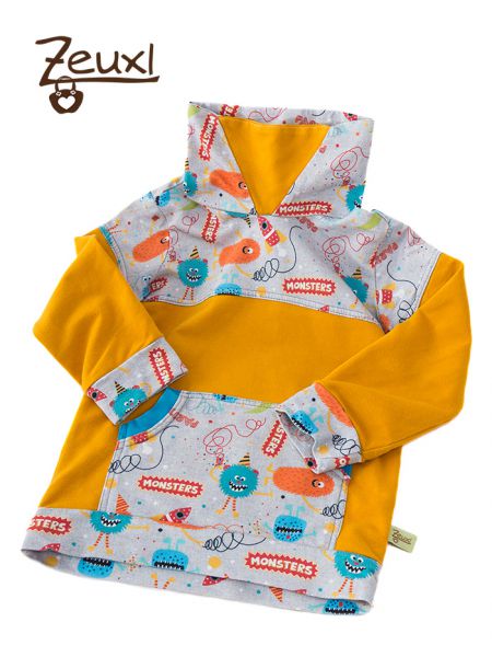 Obwohl beim gemusterten Stoff die Monster deutlich auffälliger sind, bezeichnet unser Bub diesen Pulli als Raketenpulli. Wer ganz genau schaut, kann auch eine oder zwei Raketen entdecken ;-) Hier bekam der Pulli noch eine Bauchtasche. Dabei sind die Eingriffe etwas klein geraten. Da muss ich wohl entweder beim Abpausen oder beim Zuschnitt einen Fehler gemacht haben. Glücklicherweise passen die kleinen Bubenhände gerade noch so hinein…