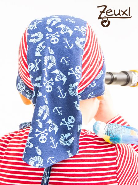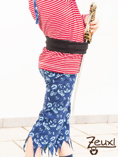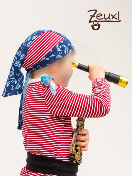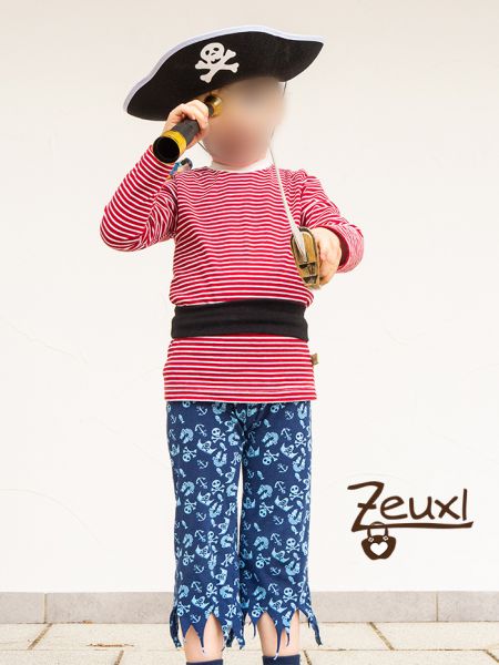 Als Kopfbedeckung nähte ich aus den beiden Stoffen ein Piratenkopftuch. Das Schnittmuster ist von Buntspechte. Natürlich bekam der Bub noch einen Gürtel um darin den Säbel und sein Fernrohr zu befestigen. Dafür nähte ich aus Bündchenstoff einen „Schlauch“ und das war´s. Lange bleiben Säbel und Fernrohr sowieso nicht am Kind.
