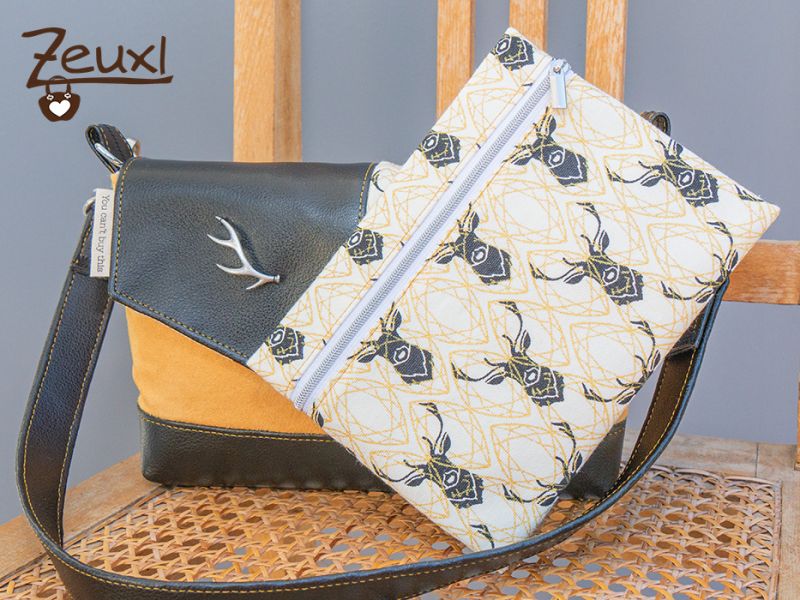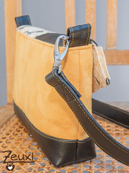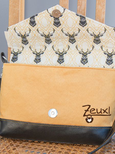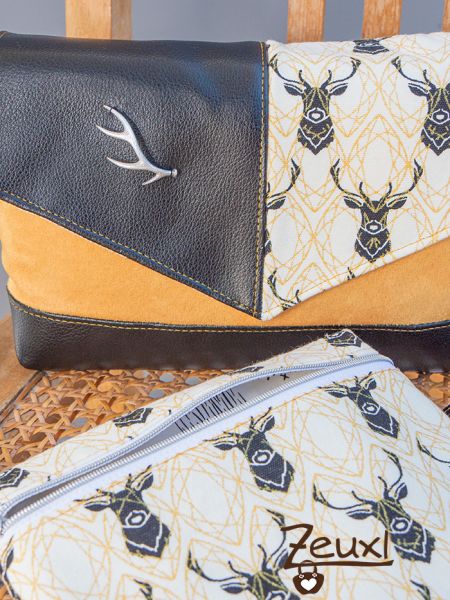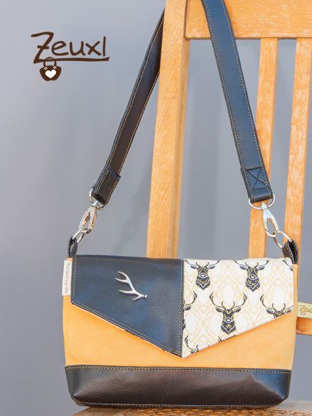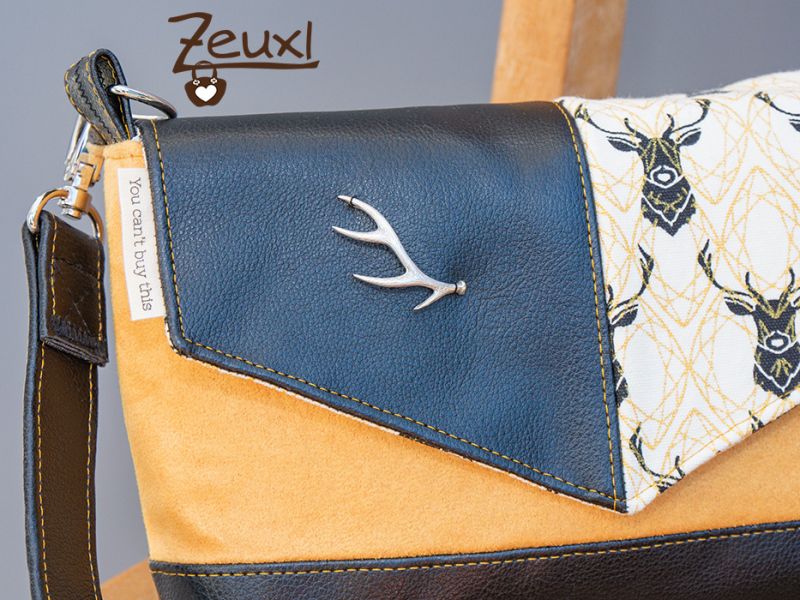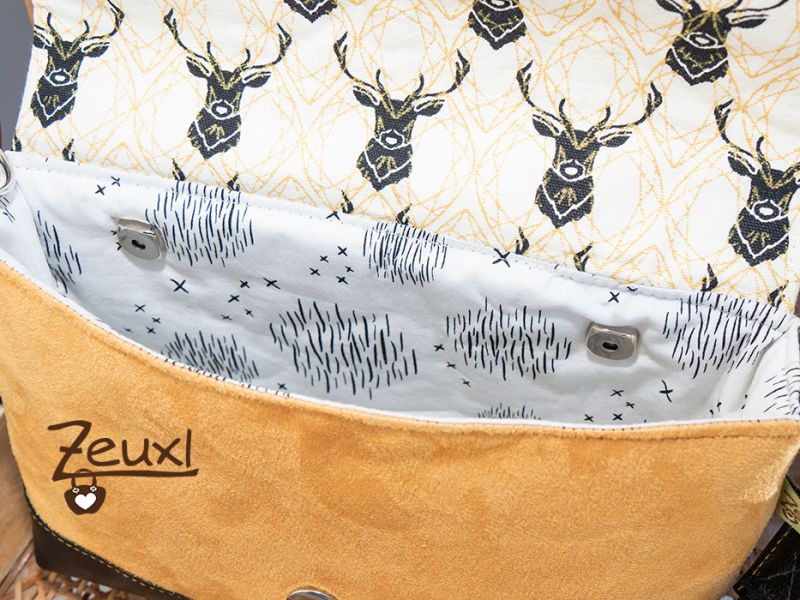 Als meine erste Josha in S (hier) am Entstehen war, hatte ich schon diese Stoffkombination im Kopf. Die lange gestreichelten Hirschköpfe, dazu schwarzes Kunstleder und dieser Stoff in goldgelber Wildlederoptik, genauso sollte es sein. Dieses Mal wie gesagt nochmal die kleine Josha und mit der spitzen Klappe.