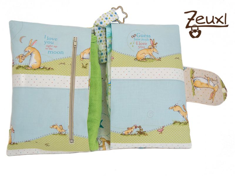 Ich finde die Größe ausreichend. Zudem habe ich noch ein Bändchen in der Mitte eingenäht, an dem ein Schnuller befestigt werden kann. Verschlossen wird alles mit einer Lasche und einem Druckknopf. Mit dem Schlüsselanhänger könnte die Windeltasche auch beispielsweise am Kinderwagen befestigt werden.