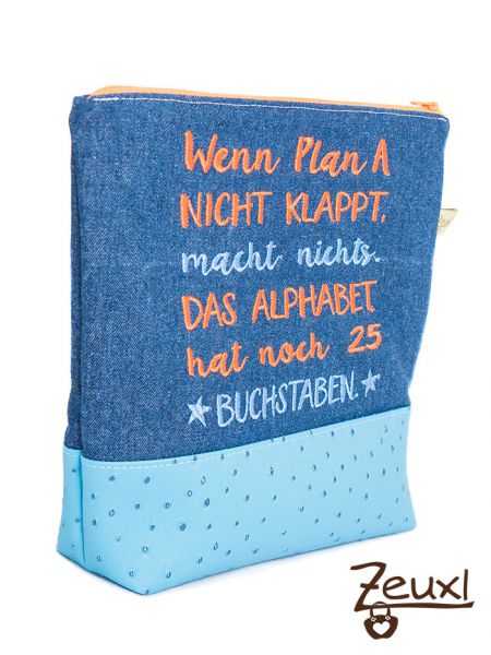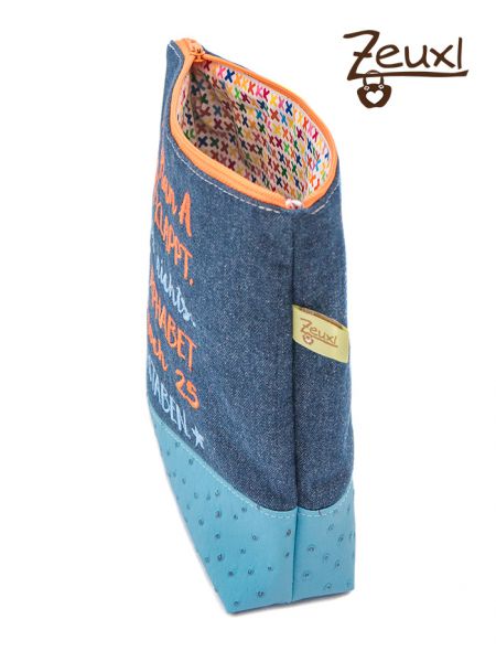 Das türkisfarbene Straußenkunstleder und der bunte Baumwollstoff als Futter passen meiner Meinung nach gut dazu. Durch die Größe des Spruchs ist diese Tasche etwas höher ausgefallen, was ja kein Nachteil sein muss. Sicherlich wird sich eine Verwendung für das Täschle finden.