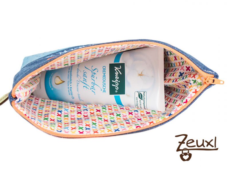 Ähnlich wie das kleine Goldtäschle wollte ich den Jeansstoff mit Kunstleder kombinieren. Da das Geschenk für die Praktikantin im Kindergarten war, durfte die Farbauswahl gerne etwas poppiger (sagt man das heute noch so?) sein.