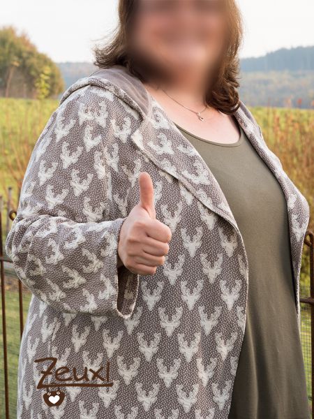 Einerseits hatte ich doch etwas Sorge, ob es nicht doch zu viele Hirschköpfe auf einem Teil für mich sind. Aber was soll´s, ich mag das Muster, die Farben und der Stoff ist sehr angenehm zu tragen. Einzig die Kapuze finde ich an mir nicht so passend. Ich glaube, ich bin doch eher der ohne Kapuze Typ. An Jacken sind sie praktisch, aber an Oberteilen brauche ich sie eher nicht.