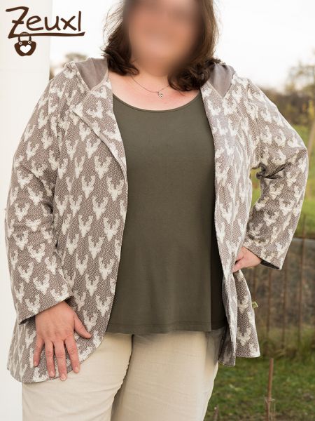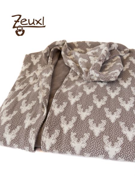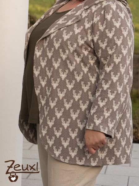 Dieser Bio-Jacquard Jersey von Albstoffe mit den Hirschköpfen drauf hatte es mir sofort angetan. Ich musste ihn einfach kaufen – für mich, nicht für´s Kind. Zufällig hatte ich mir auch kurz zuvor ein Schnittmuster von Schnittgeflüster, La Jazida gekauft. So war schnell klar, was aus dem wunderschönen Kuschelstoff werden sollte.