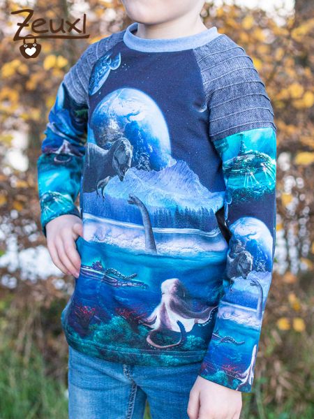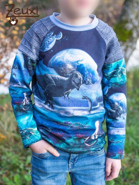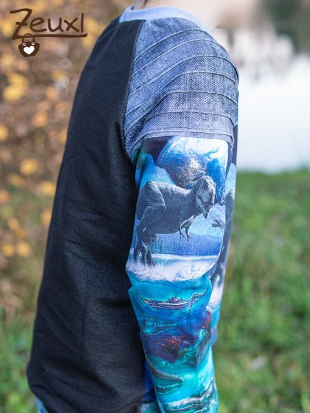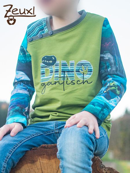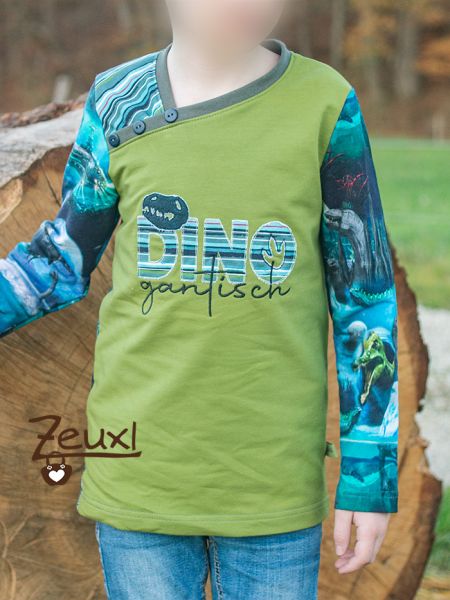 So konnte ich drei, was Schnitt und Stoffkombination angeht, unterschiedliche Shirts daraus nähen. Einmal das Longsleeve von Mamasliebchen. Das erste Drittel des Panels verwendete ich hier für den Rücken, den All-over-Stoff für die Ärmel und vorne den grünen Stoff. Zusätzlich bestickte ich die Front mit dem Dinogantisch Schriftzug von Fadenspiel – Stick- und Plotterdateien mit Herz, den ich damals mit probesticken durfte. Im Dezember gibt es übrigens eine tolle Rabattaktion im Fadenspiel-Shop.