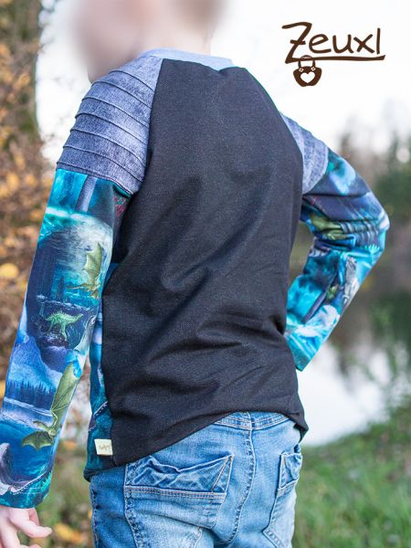 Das zweite Shirt ist ein Carl Vito von Fusselfreies. Mit dem Bieseneinsatz an den Schultern, denn Biesen mag der Bub so gerne. Dafür verwendete ich einen Rest Look like Jeans French Terry in Grau und für die unteren Ärmel wieder den All-over-Stoff. Am Rücken entschied ich mich für einen festeren Jeansjersey in Schwarz.