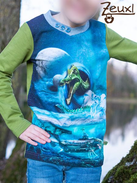 Nummer drei ist ein Kalleson Shirt von Lumali geworden. Die Ärmel und der untere Rücken diesmal in Grün. Die grüne Farbe passt hier super zum Dino auf der Vorderseite. Vorne ist auch der überlappende Halsausschnitt der besondere Hingucker, den ich beim Kalleson Shirt so gerne mag.