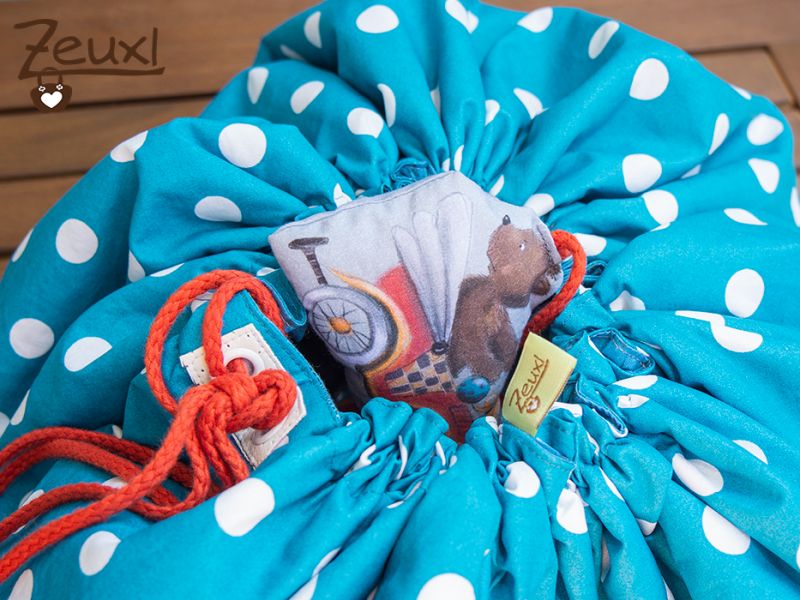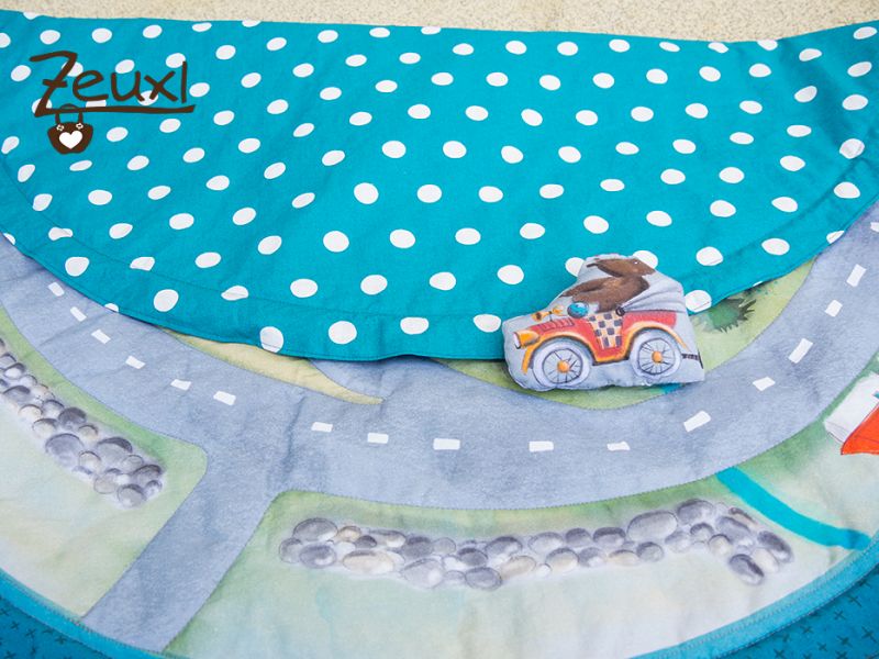 Auf dem Panel war nicht nur der runde Spieleteppich aufgedruckt, sondern auch Fahrzeuge. Eines davon nutzte ich um die Enden der Kordeln zu fixieren. So werden sie nicht versehentlich in den Tunnel gezogen und dekorativ ist es noch dazu.
