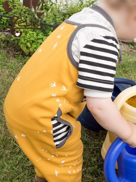 Glücklicherweise war noch genug vom schönen Stoff übrig, so dass ich auch für ihn noch was nähen konnte. Kürzlich habe ich im Internet diverse, sehr schöne Nähbeispiele zu der Latzhose Löwenzahn gesehen. Ich mag Einteiler bei Babys und Kleinkindern total gerne, daher konnte ich nicht anders und musste dieses E-book Löwenzahn von Firlefanz einfach kaufen. Die Gelegenheit den neuen Schnitt auszuprobieren.