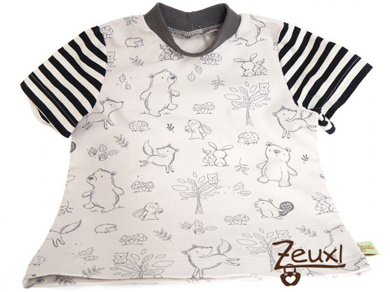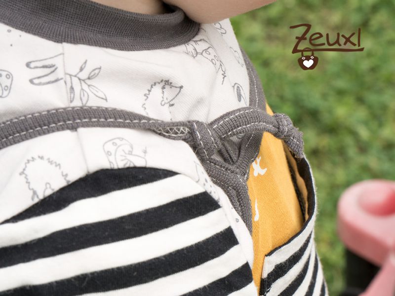 Genäht habe ich ein Shirt aus dem Schnitt für das Longsleeve#8 von mamasliebchen, mit normalem Halsausschnitt und kurzen Ärmeln. Allerdings werde ich nächstes Mal die Ärmel etwas länger machen, damit nicht immer der Body rausspitzelt. Da die meisten Bodys des Buben naturfarben sind ist der "Bodyblitzer" nicht ganz so dramatisch. Bei meinem ersten Versuch ein Shirt nach diesem Schnitt zu nähen musste ich feststellen, dass es eher schmal geschnitten ist und in der Breite zwei Größen größer notwendig sind, damit es beim Buben schön locker sitzt. Die Ärmel sind aus dem Ringeljersey, den ich auch für die Hosentaschen der Latzhose verwendet habe.
