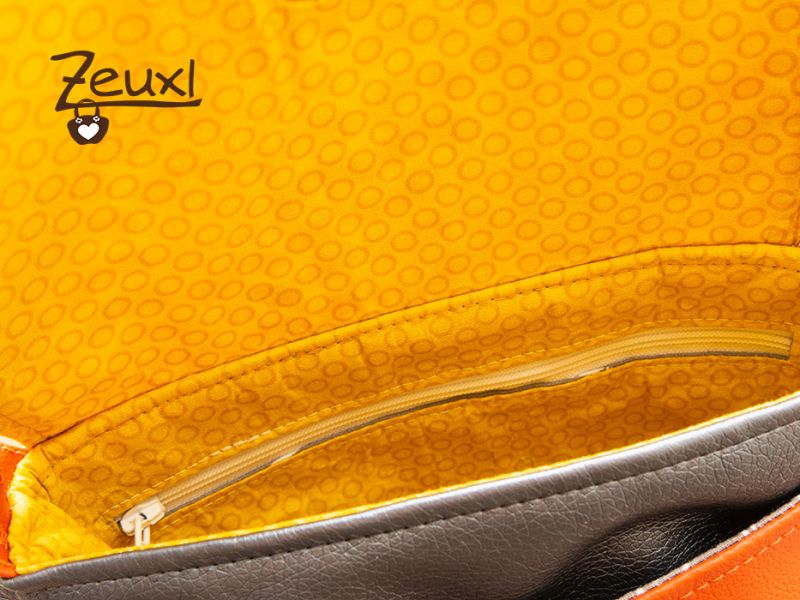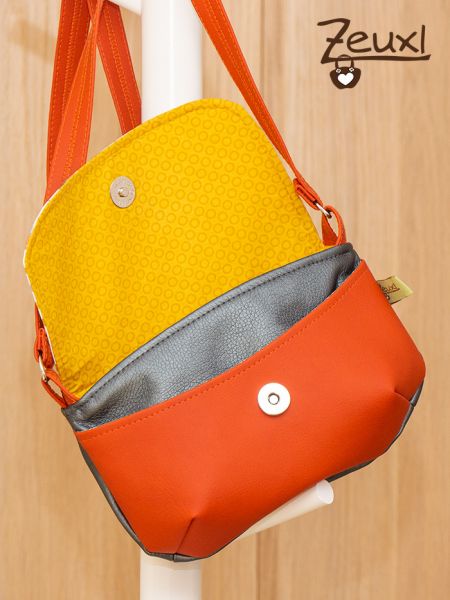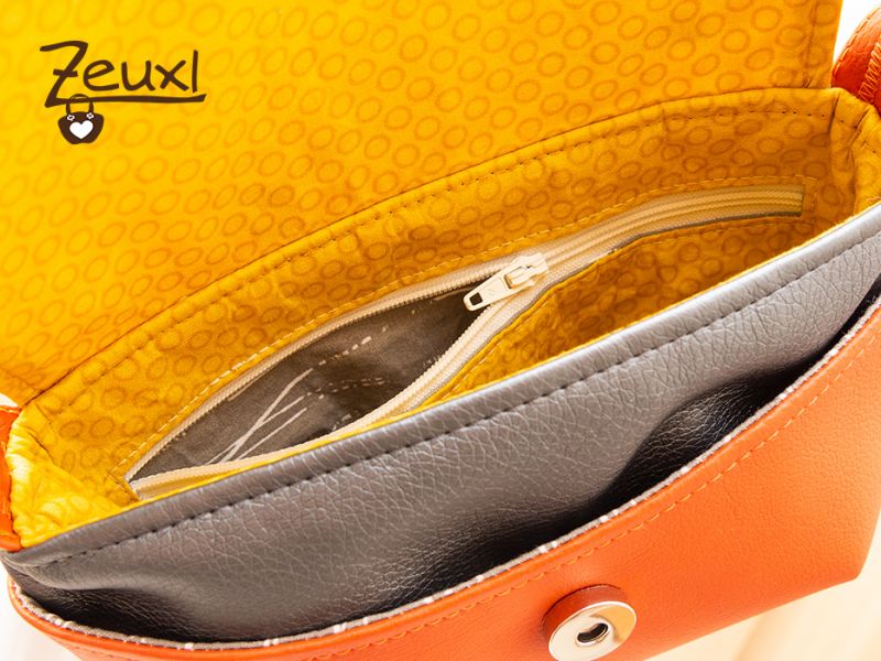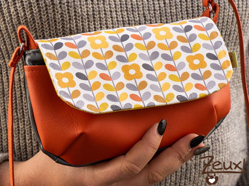 Dafür hatte ich doch tatsächlich mein bedrucktes Kunstleder, welches ich gut und lange gehütet hatte, angeschnitten. Mit der Kombination mit rostorangen Kunstleder und senffarbenen Baumwollfutterstoff wurden einige meiner Lieblingsfarben ergänzend zur blumigen ELEN•i vereinigt.