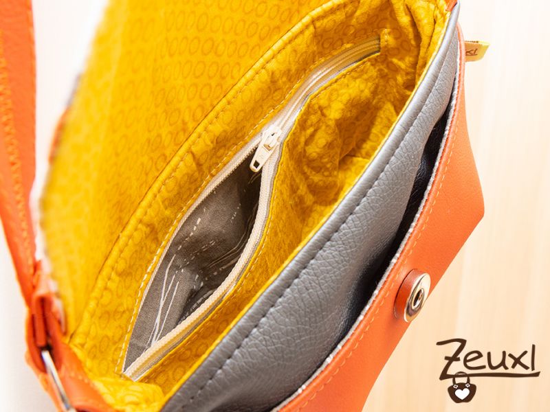 Verschlossen wird ELEN•i mit einem Magneten, sie besitzt ein Einsteckfach unter der Klappe, sowie innen ein Reißverschlussfach um Geld, Schlüssel, Ausweis oder ähnliche Kleinigkeiten zu verstauen.