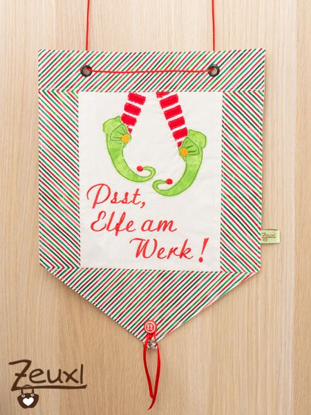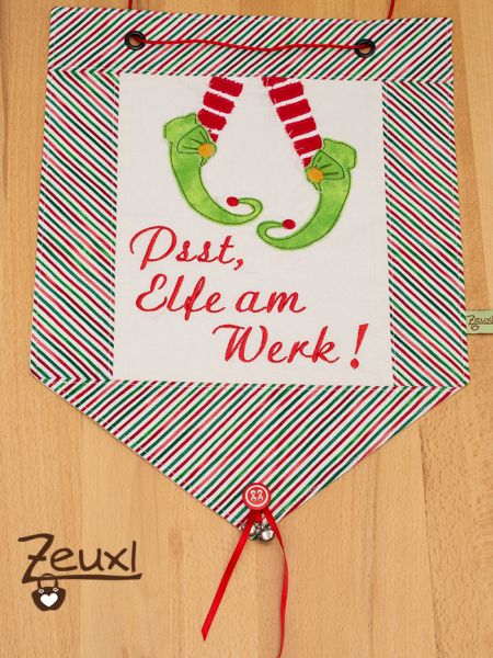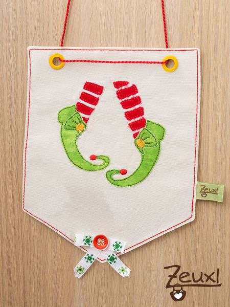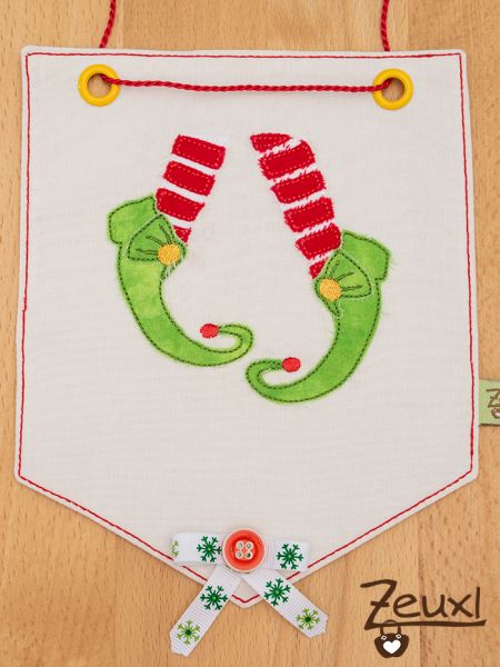 Die Elfenstiefel machen sich nicht nur gut auf dem Tischset. Ich bestickte zwei Wand- oder Türhänger damit. Auf cremefarbenen Baumwollstoff ist der kleinere Hänger relativ schlicht gehalten. Nur der, mit rotem Garn abgesteppte Rand, sowie die Schleife und der Knopf sind kleine Farbakzente.