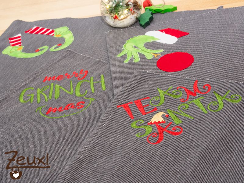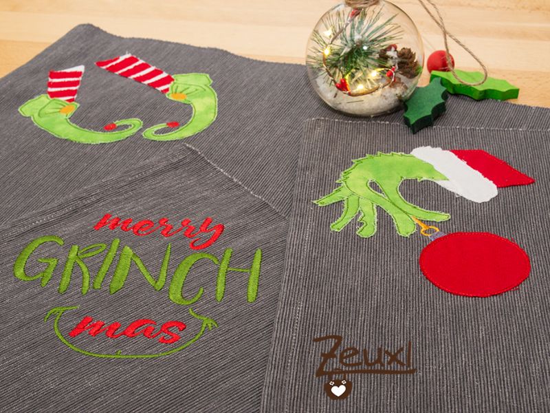 Als Nadine von Fadenspiel – Stick- und Plotterdateien mit Herz die schönen Elfenbeine zum Probesticken bereitstellte, hatte ich gleich mehrere Ideen dafür. Ich wollte unbedingt Tischsets damit besticken. Aber gleiche Tischsets fand ich langweilig. Deswegen nutzte ich gleich noch zwei weitere Dateien von Nadine. Einmal den Grinch-Schriftzug und auch die Grinch Hand. Beides gibt es schon länger in ihrem Shop zu kaufen. Die Elfenstiefel sind ganz neu und im aktuellen Fadenspiel Adventskalender zu finden. Der Kalender enthält 24 neue Stickdateien und dabei handelt es sich um Dateien, die im Großteil für das ganze Jahr geeignet sind und vor allem Kinder ansprechen. Alle Dateien sind ab 10x10 und einige auch in verschiedenen Größen stickbar.