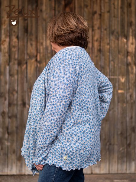 Für das neue Freebook von Konfetti Patterns ist dieser Stoff genau das Richtige, denn mit so einem leichten Fall kommt die Wasserfalloptik der Vorderteile besonders gut zu Geltung. Statt klassisch zu säumen verwendete ich bei meiner zweiten Margarete, die auch beim Probenähen entstanden ist, einen Rollsaum als Kantenabschluss. Dabei finde ich die gewellte Optik schön passend zum leichten Stoff.