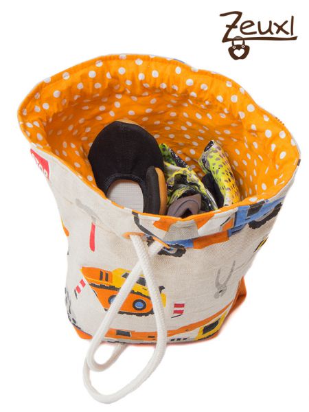 Da unsere Kindergartentasche eher farblich zurückhaltend daher kommt, durfte der Turnbeutel mehr Farbe zeigen. Wie gut, dass von seinem geliebten Baustellenstoff, aus dem ich schon ein großes Utensilo für ihn genäht hatte, noch genug übrig war. Für innen verwendete ich einen orangenen Baumwollstoff mit weißen Punkten.