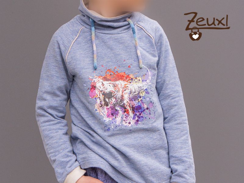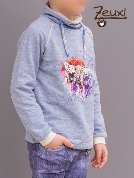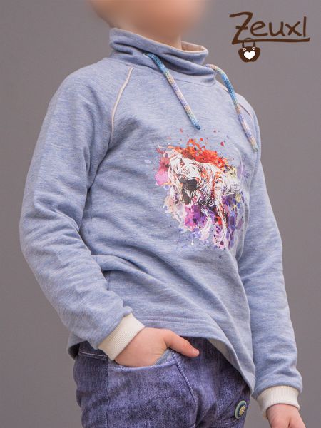 Der Bub bekam bereits (hier) Jacken zum drüber ziehen und viele Oberteile aus French Terry, die ihm im Kindergarten zu warm gewesen wären. In der Schule findet er selbst diesen Stoff noch nicht warm genug. Im Stoffladen vor Ort bin ich auf einen uni-melierten Sweat gestoßen, der sich preislich im Rahmen hält und in einigen Farben vorrätig ist. Damit wollte ich es mal versuchen.
