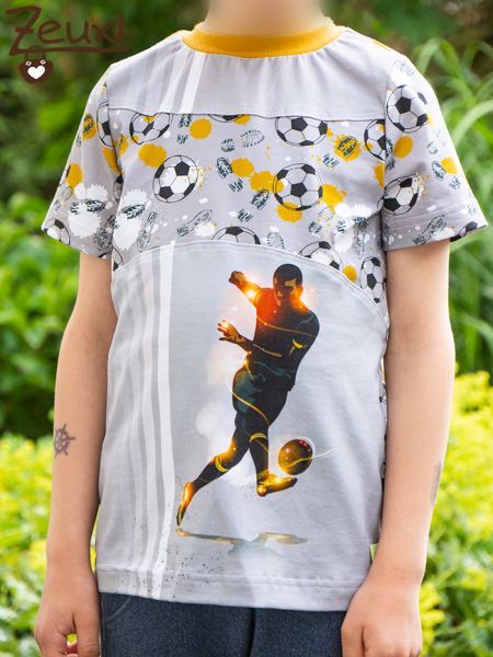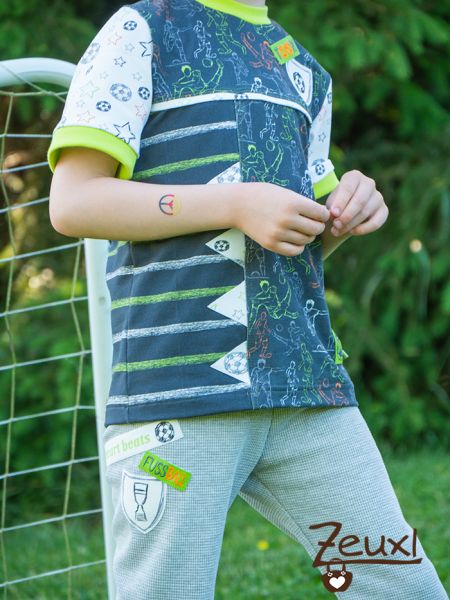 Endlich bot sich die Gelegenheit einen gehüteten Stoffschatz-Rest zu vernähen. Bereits 2018 nähte ich daraus ein Set (hier) für den Buben. Der dunkle Stoff mit den Fußballspielern und der passende dunkle Streifenkombistoff sind noch Reststücke. Aber den hellen Kombistoff hatte ich später noch dazu gekauft. So konnte ich nun aus den Resten plus dem hellen Kombistoff ein tolles Shirt zusammenstellen.