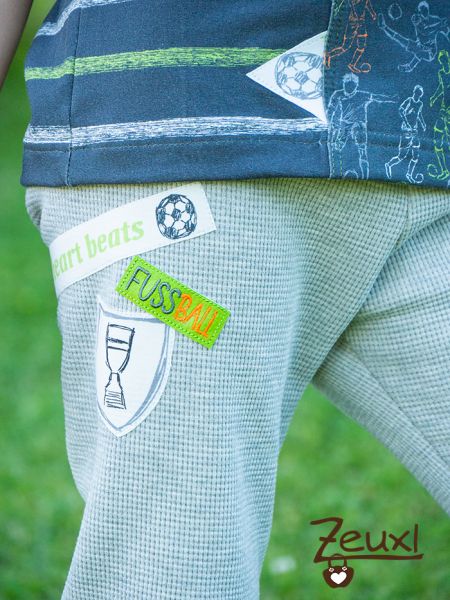 Sowohl Hose, wie auch das Shirt betüddelte ich (passend zum Shirtnamen) mit den Wappen aus dem Randstreifen des Stoffes und Sticklabels von Fadenspiel – Stick- und Plotterdateien mit Herz.