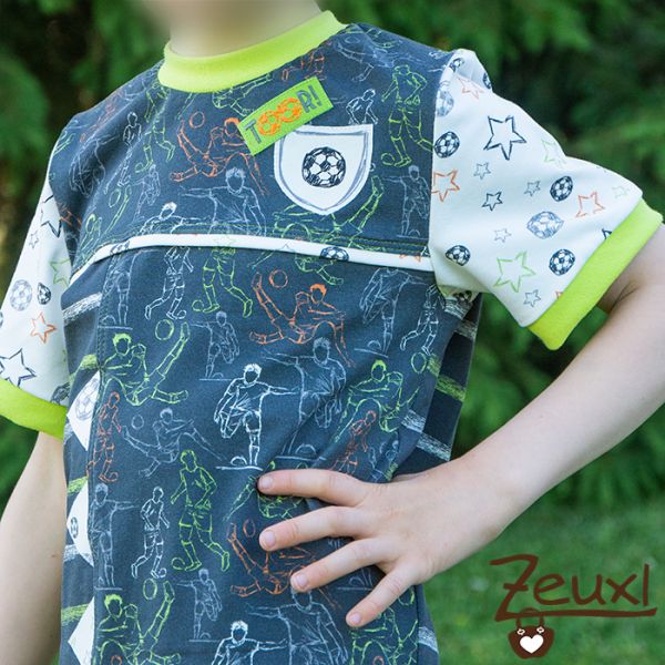 Das Freebook von Mein Lausbub und Moldüser, das Tüddelshirt Kai, eignet sich perfekt um verschiedene Stoffe in Szene zu setzten. Somit ideal für besagte Fußballstoffe. Mir gefällt das Ergebnis richtig gut.