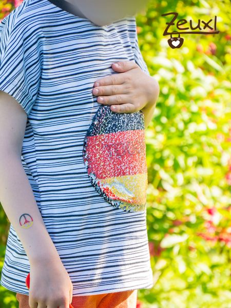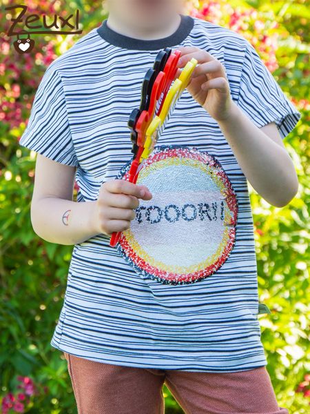 Unser Bub wünschte sich unbedingt ein Shirt mit Streichel-Dings. Also ein Wendepaillettenmotiv. Glücklicherweise befand sich genauso ein Patch in meinem Paket von Trolinum. Was für ein tolles Goodie! Ich wählte einen schlichten Schnitt, das Eazzy Shirt von Sara & Julez und auch einen ebenso schlichten Stoff. Der schwarz-weiß gestreifte Jersey passt ganz gut dazu, finde ich.