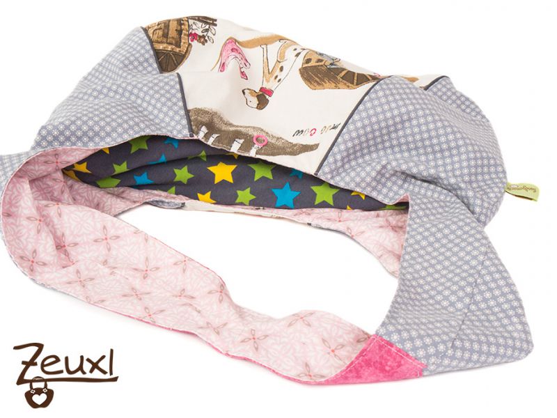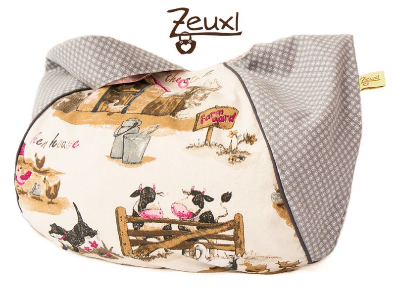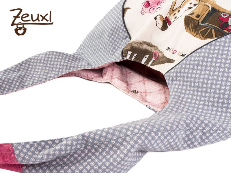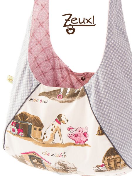 Ich finde die Form ist mal was anderes und durch die Unterteilung kann man toll Stoffe miteinander kombinieren. Da darf auch mal zu etwas „gewagteren“ Farben und/oder Mustern gegriffen werden. So habe ich mich getraut den lustigen Bauernhoftiere-Stoff zu Blümchen in Grau/Weiß zu kombinieren. Oben am Träger ist ein Stück Pink eingesetzt, als Hingucker natürlich (und weil der Blümchenstoff leider etwas knapp war - psst!). Innen ist die Tasche dann einheitlich in Rosa gehalten.