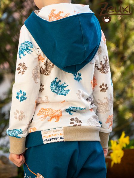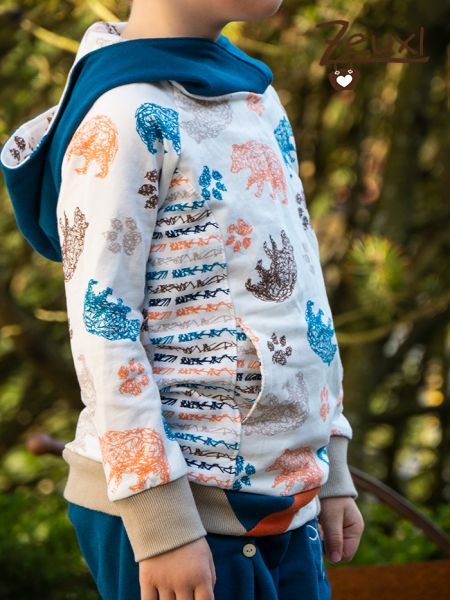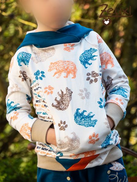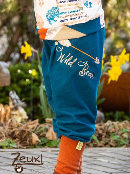 Bei der Hose entschied ich mich wieder mal für eine Karl Knopf. Da brauche ich wohl nicht mehr viel dazu schreiben, ich liebe diesen Schnitt einfach. Passend zum Bärenhoodie verwendete ich die Wild Bear Stickdatei von Fadenspiel – Stickdateien mit Herz.